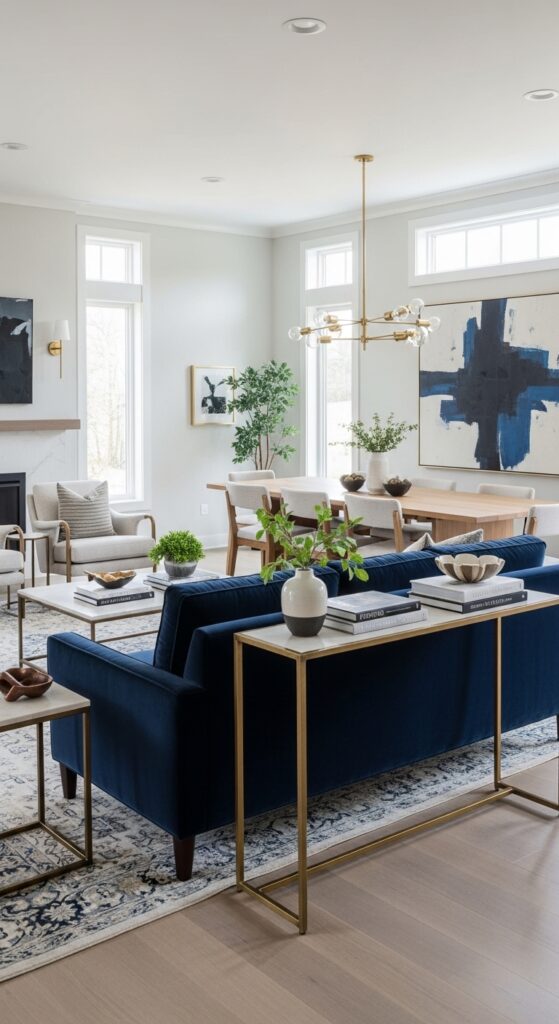 If you want a clear physical divide, place your sofa with its back toward the dining table. This “back-to-back” arrangement acts as a low-level wall, creating a cozy, enclosed feeling in the living room while keeping the dining area feeling like its own “room.” To make this look expensive, place a slim console table behind the sofa. This provides a surface for Neo Deco lamps or Jade-colored vases, acting as a decorative bridge between the two zones. It’s a classic layout for narrow rooms that keeps the traffic flow open on either side of the furniture.