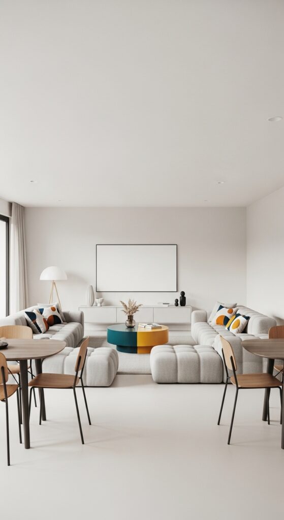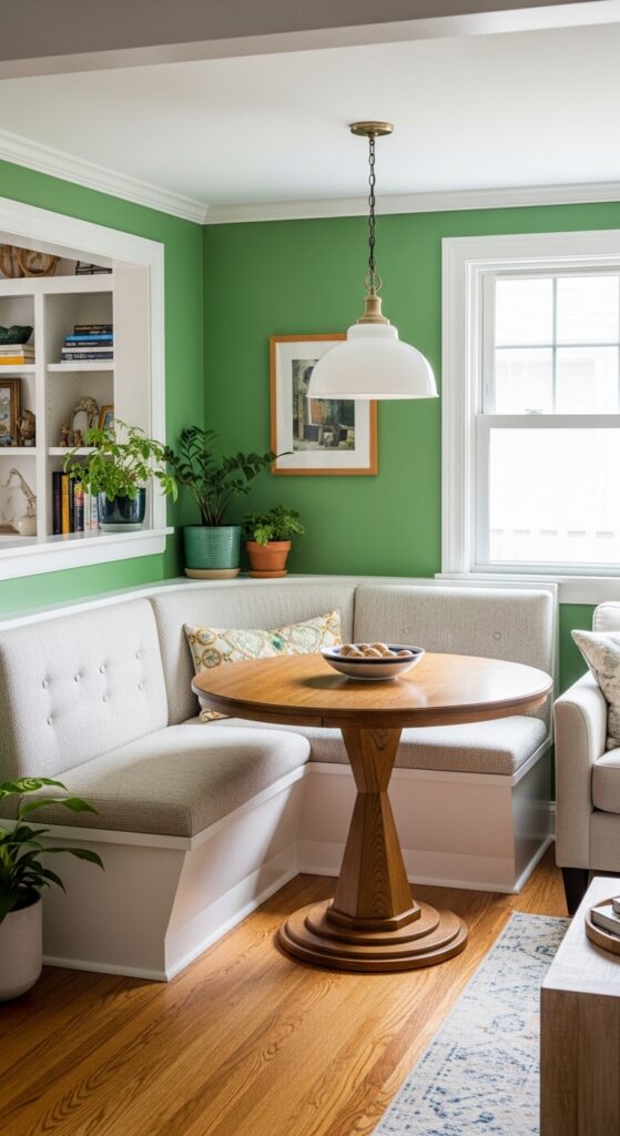 In very small combo rooms, pushing the dining table into a corner using “banquette” or “booth” seating can save massive amounts of floor space. Use a built-in bench along two walls and pair it with a round pedestal table. This creates a “bistro” vibe that is separate from the open living area. You can even paint the corner in a slightly darker shade of Jade or Navy to create a “jewel-box” dining nook. This leaves the rest of the room open for a large, comfortable sofa and media center, providing a high-end, functional layout for urban apartments.