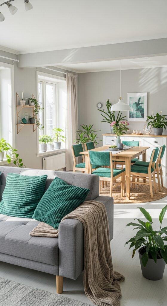 While the zones should be separate, the color palette must be unified to avoid a “choppy” look. In 2026, using a monochromatic base like “warm sand” and accenting both areas with Jade Green is a top trend. Use Jade velvet pillows on the living room sofa and matching Jade seat cushions or a table runner in the dining area. This “color thread” pulls the two spaces together, making them feel like part of a single, intentional design. It creates a high-end, “designer” feel that looks incredible in Pinterest photos because the visual harmony is instantly recognizable.