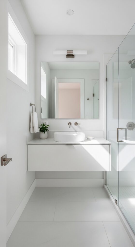 Never underestimate the power of a gallon of paint. In a small master bathroom, dark or dingy walls make the space feel like a cave. By applying a crisp, bright white or a very soft “greige,” you instantly reflect more light, making the room feel twice as large. For a professional look, choose a semi-gloss or satin finish to resist moisture and mildew. This simple change provides a clean “blank canvas” that allows your towels and accessories to pop. It is the most cost-effective way to achieve a high-end, minimalist look that looks stunning in Pinterest photos.