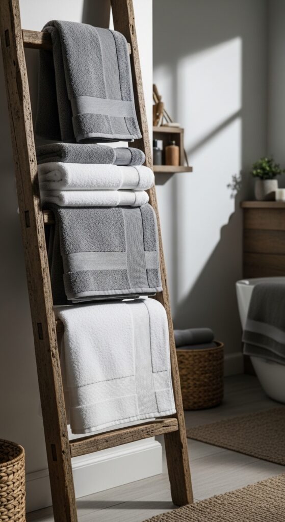 Instead of a standard wall-mounted towel bar, which can look a bit utilitarian, use a leaning wooden blanket ladder. It adds height and texture to the room. Drape your most aesthetic towels over the rungs. This is a great solution for renters or those who don’t want to drill holes into tiled walls. A ladder takes up very little floor space but offers a lot of visual impact. You can even hang a small basket from one of the rungs to hold extra washcloths or a loofah, adding to the spa-like atmosphere.