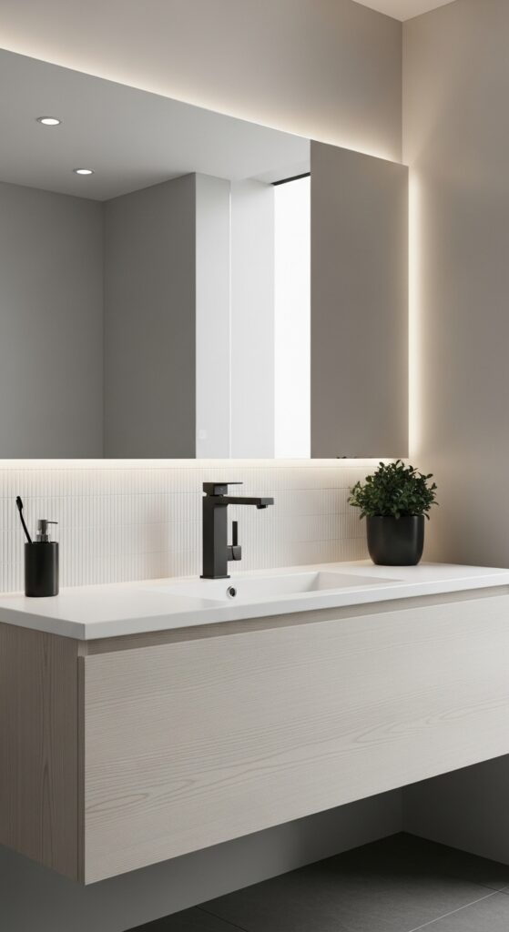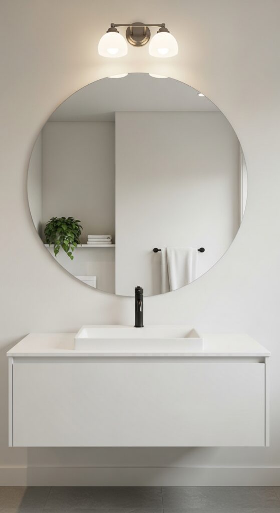 Standard “builder-grade” mirrors often have clips that look cheap, or they are just plain glass sheets glued to the wall. Replacing your old mirror with a large, sleek frameless circular mirror or a thin-rimmed black metal frame mirror can transform the vanity area. A larger mirror reflects more of the room, creating an optical illusion of extra depth. If you are on a tight budget, you can even build a DIY wood frame around your existing mirror using pine boards and liquid nails to give it a custom, built-in appearance.