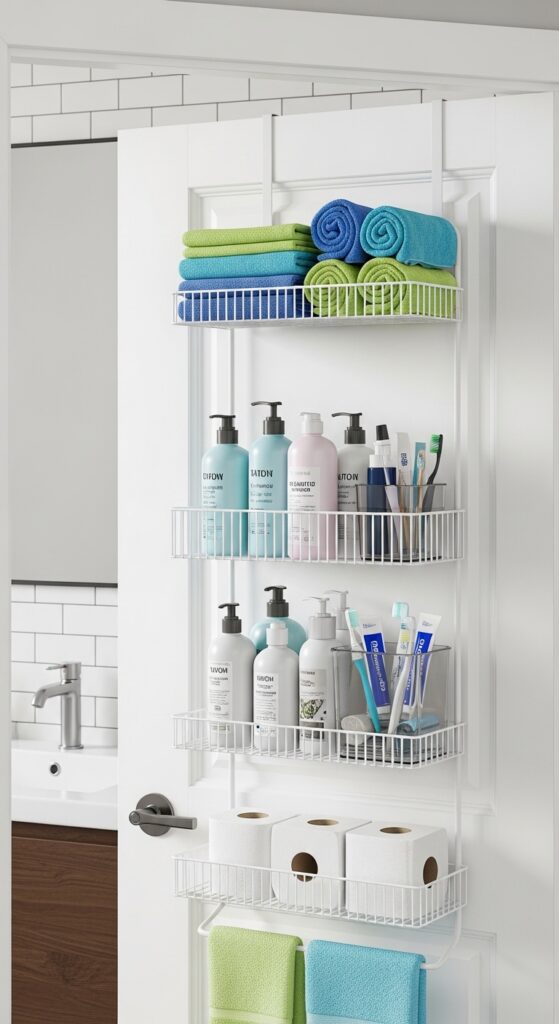 Most people forget about the space behind and above the door. An over-the-door organizer with clear pockets or sleek metal baskets can hold extra toilet paper, hair tools, and cleaning supplies. This keeps the “ugly” necessities out of sight but within easy reach. For a more permanent look, build a simple shelf directly above the door frame. This is the perfect spot for storing items you only use occasionally, like extra towels or seasonal toiletries. It’s a brilliant way to declutter a small master bathroom without adding bulky furniture.