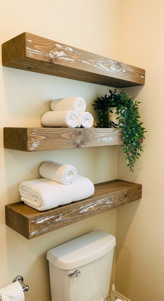 In a small master bath, floor space is precious. Vertical storage is your best friend. Install two or three thick, reclaimed wood floating shelves above the toilet or next to the vanity. This adds warmth and a touch of nature to a room that is usually full of “cold” surfaces like porcelain and chrome. Use these shelves to display neatly folded white towels, glass jars filled with cotton balls, and a small trailing plant. This setup mimics the look of farmhouse bathroom ideas while keeping your counters completely clear of clutter.