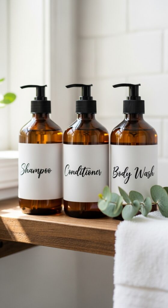 Mismatched plastic soap bottles and shampoo containers create “visual noise” that makes a small room feel crowded. Buy a set of matching glass or amber dispensers for your hand soap, shampoo, and conditioner. Use a label maker or buy waterproof minimalist labels to mark them. This creates a cohesive, high-end look in the shower and on the vanity. It’s a very low-cost upgrade that makes your bathroom feel like a curated space rather than a grocery store shelf. It’s the final touch for a perfect budget remodel.