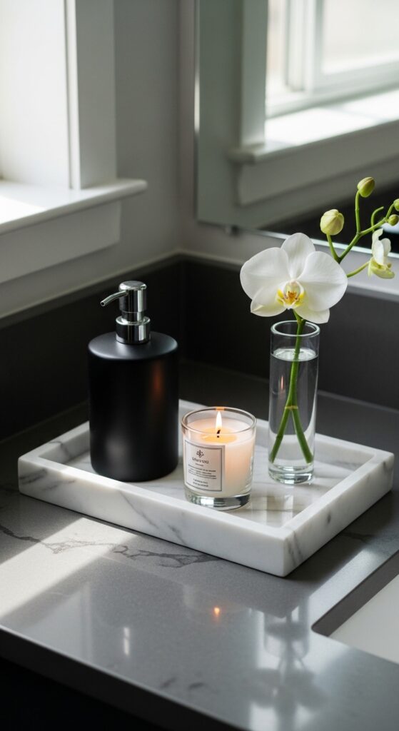 To keep your vanity counter from looking messy, use a small marble or wooden tray to corral your everyday items. Place your hand soap, a candle, and a small vase of flowers on the tray. By grouping these items together, they look like a deliberate “vignette” rather than just clutter. It makes cleaning the counter easier, too—just lift the tray and wipe. This is a classic interior design trick that adds a layer of sophistication to even the smallest of master bathrooms, making it look move-in ready.