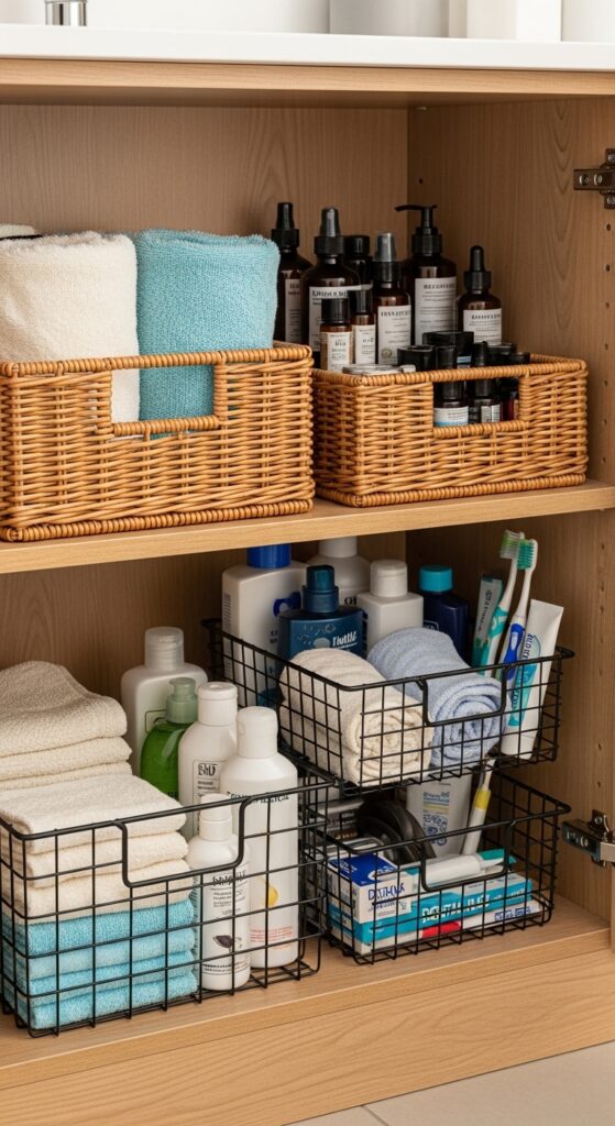 If you have an open vanity or even one with deep cabinets, use matching wicker or wire baskets to organize your items. Group your toiletries by category—one for skincare, one for hair products, and one for first aid. This prevents the “junk drawer” effect where things get lost in the back of the cabinet. Baskets look much better than loose bottles and tubes. When you open your vanity, seeing everything neatly tucked into baskets provides a sense of calm and order that is essential for a relaxing master suite.