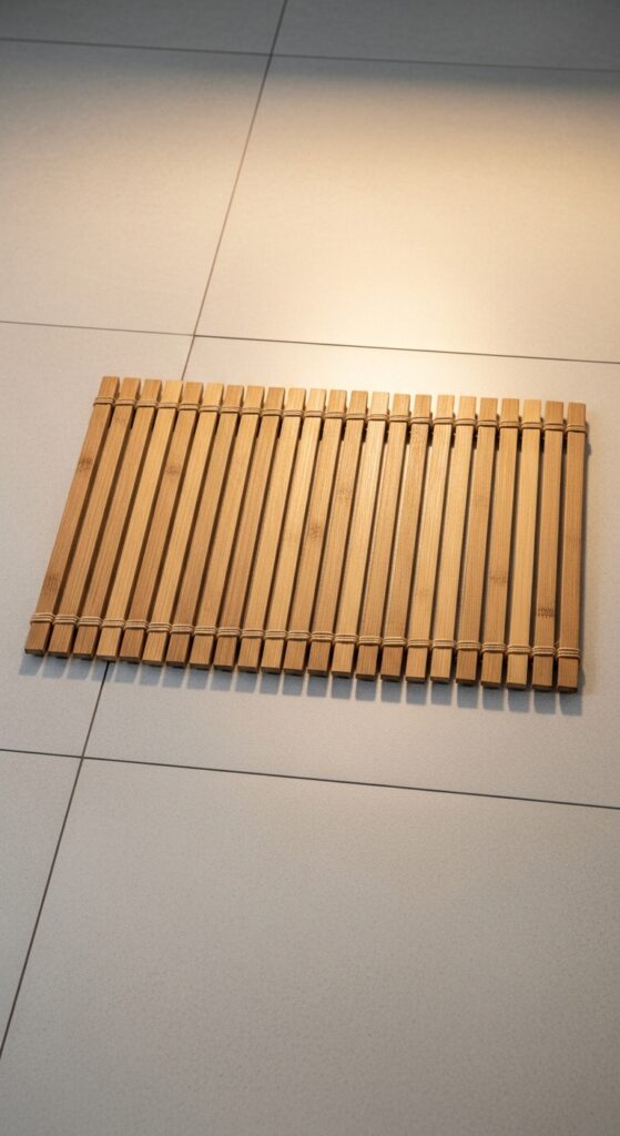 Ditch the soggy, carpeted bath mats that harbor bacteria and look dated. A wooden teak or bamboo slat mat adds a natural, “Zen” element to your floor. It feels great underfoot and allows water to evaporate quickly. Visually, it breaks up the monotony of tile or vinyl flooring and introduces a warm wood tone that balances out the white porcelain of the tub and toilet. It’s a small investment that makes your small master bathroom feel like a high-end Japanese spa or a luxury resort.