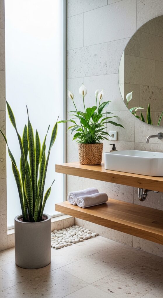 Plants bring life and color to a bathroom, making it feel fresh and organic. In a master bath, the humidity from the shower is perfect for varieties like Snake Plants, Pothos, or Peace Lilies. Place a small pot on your new floating shelves or hang a spider plant from the corner of the ceiling. The vibrant green leaves contrast beautifully against white tiles and wooden accents. Not only do they look great for Pinterest photos, but they also help purify the air, making your morning routine feel more connected to nature.