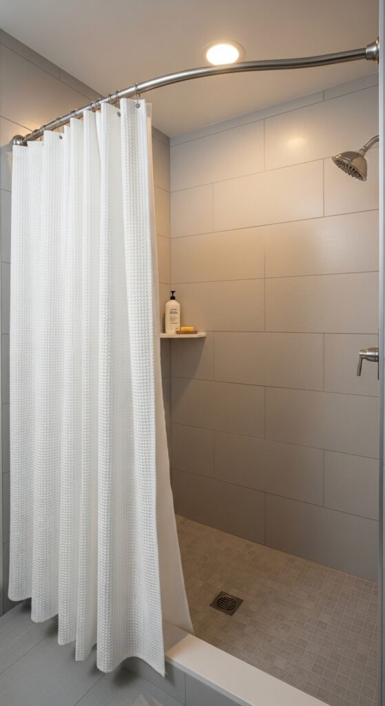 A curved shower rod is a simple luxury that makes a huge difference in a small master bathroom. It arcs outward, giving you several extra inches of elbow room inside the shower without moving any walls. Pair this with an extra-long, fabric shower curtain that reaches all the way to the floor. Hanging the rod higher (closer to the ceiling) draws the eye upward, making the ceiling feel taller. This simple trick adds a “hotel” feel to your daily shower and makes the bathroom feel much less claustrophobic.